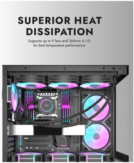 | Fan Support | Side: 120mm x3 / Rear: 120mm x1 / Top: 120mm x3/140mm x2 / PSU: 120mm x2 / HDD Bracket: 120mm x1 |