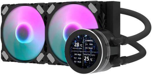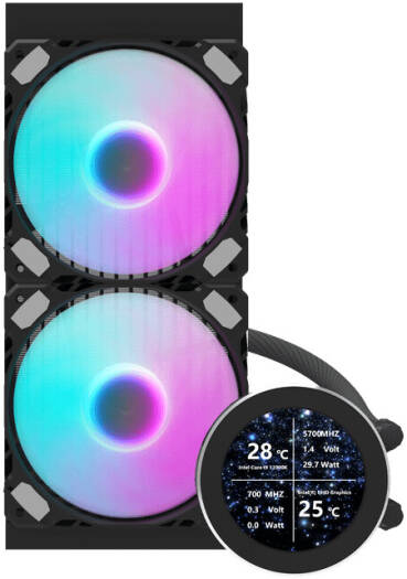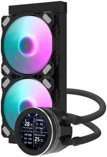 DarkFlash Nebula DN240S Liquid CPU Cooler, 240mm Radiator, 2x 240mm aRGB Fans, 2.1″ IPS Display, 61.7CFM Fan Airflow, 1800 RPM Fan Speed, 30dBA Noise Level, Copper Base Water Block, Black | DN240S