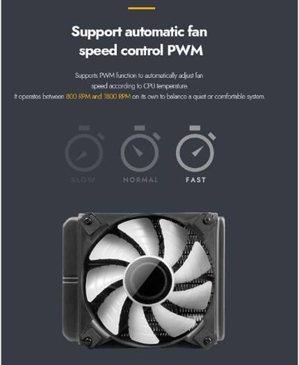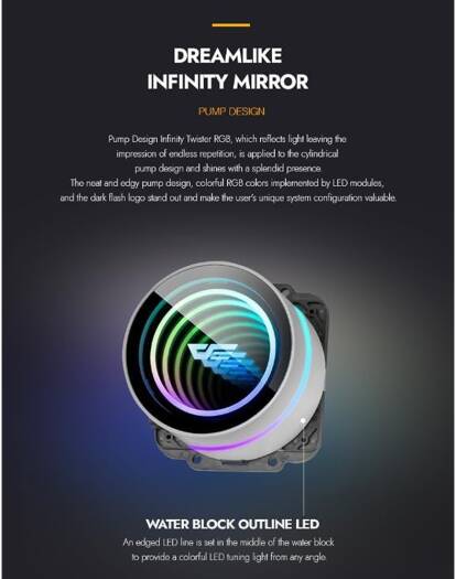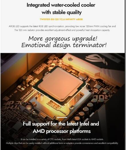Twister DX120 V2.6 The Darkflash Twister DX120 V2.6 ARG CPU Liquid Cooler offers advanced cooling performance with its ARGB infinity mirror water pump featuring 360-degree rotation for customizable aesthetics. Compatible with a wide range of Intel and AMD sockets, including the latest versions, it ensures versatility in PC builds. With high-speed fans capable of rotating at 2700 RPM while maintaining low noise levels, it delivers efficient thermal management. The double structure design and optimal impeller structure enhance stability, lifespan, and overall performance. Additionally, it supports motherboard ARGB integration, enabling synchronization with compatible RGB light sync technology for vibrant lighting effects, making it a perfect choice for enthusiasts seeking both performance and aesthetics in their builds.