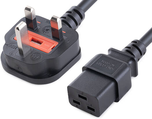 UK-C19 The DataPro 9237 series Computer Power Cord is used to adapt a UK style (type G) connector to any voltage-compatible device with a standard C19 inlet. C19 is a less common type of power connector often found on enterprise-class servers and network infrastructure. Standard computer equipment is more likely to use this cable’s C14 equivalent. The DataPro 9237 series Computer Power Cord is used to adapt a UK style connector to any voltage-compatible device with a standard C19 inlet. The device side has a C19 power type connector; the wall outlet end has an UK BS 1363 (type G) 230 / 13A outlet connector.