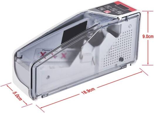 Specifications: Color: Light Grey Material: ABS Plug: UK, 220V 50/60Hz Battery Operated: 4 * AA Batteries (not included) Power Consumption: 2W Counting Speed: Approx. 600 Bills / Minute Display Screen: 3 Digits(Max. 999) Item Size: 18.9 * 5.0 * 9.0cm / 7.4 * 2.0 * 3.5in Item Weight: 344g / 12.1oz Package Size: 20.5 * 13.3 * 8.5cm / 8.1 * 5.2 * 3.3in Package Weight: 681g / 24.0oz Package List: 1 * Currency Counter 1 * Counting Guide 1 * Power Adapter 1 * Carrying Bag 1 * User Manual(English)