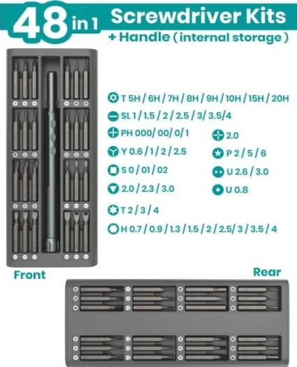 Mini Portable Screwdriver Set,Magnetic Driver Kit for Computer ,Cell phone,Camera,Eyeglasses,Watches ,Toys,Game consoles ,Hand-held Devices. Specifications Dimensions:168*66*16mm (with case on) 6.61×2.6×0.63″ 152*63*13mm 5.98×2.48×0.51″ Weight:258.7g / 9.12oz. Magnetic Driver Bits: 48 in all Bits Length:27mm 1.06″ Handle Length:126.5mm 4.98″ Handle + Bit:143mm 5.63″ Bits Material:S2 Tool Steel(Hardness:60HRC) Handle Material:Aluminium Alloy Portable Case Material:Aluminium Internal Box:ABS (with magnetism) Package Includes 1 x Klearlook 48 in 1 Screwdriver Bits 1 x Handle 1 x Storage Case Multi-functional Precision Screwdr