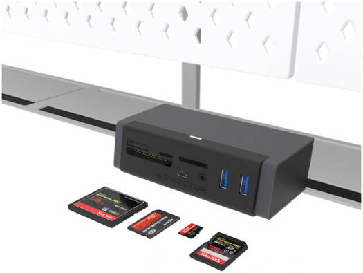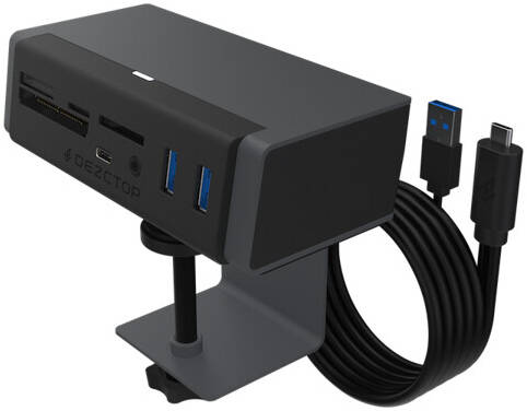 USB Type-C 7-in-1 Hub With the flexibility to location in multiple fixing points on DEZCTOP desks, the USB-C 7-in-1 Hub provides numerous connectivity outputs from one USB-C and 1 USB 3.2 Gen2 input. The hub provides two USB 3.2 outputs, a USB-C output and a 4-in-1 memory card reader, along with an audio/microphone output jack. Remove the need for multiple adapters and reduce cable clutter with this specifically designed hub. Specifications Model Number DA-UC7HUB-GE1