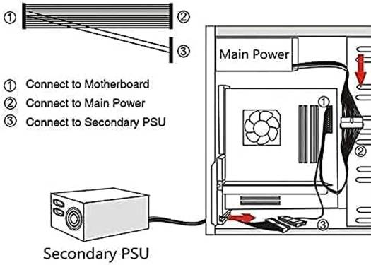 Dual PSU 24-Pin ATX Motherboard Adapter Cable – 30cm Product Features Additional PSU Compatibility: Allows connection of an extra PSU to your ATX motherboard. Intense Gaming Design: Specifically designed for high-intensity gaming purposes. Motherboard Compatibility: Compatible with 24P and 20P ATX motherboards. Ports: 1x 24p (20+4) male port and 2x 24P female ports. Cable Length: 30cm (centimetres) Installation Precautions: – Correct Insertion: Ensure proper direction when inserting the cable to prevent device damage. – Avoid Reverse Insertion: Do not insert the cable backwards or in the wrong position. – Secure Insertion: Hold the socket while inserting the cable to prevent excessive force on socket pins.