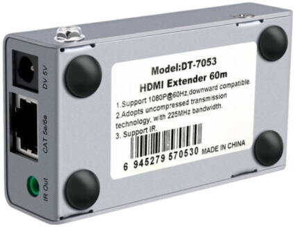 DT-7053 This extender supports HDMI resolution 1080P@60hz. The far end image restoration effect is clear and natural with no obvious attenuation after the extension of Cat5e/6e cable, and the transmission distance can be up to 60 meters. The IR return function is added to facilitate the users to control the monitor switch, adjust the volume and switch TV channels. It is widely used in computer teaching system, high quality multimedia display, video conference, computer, LCD plasma display conference, digital home theater, exhibition, education, finance, scientific research, meteorology, etc.