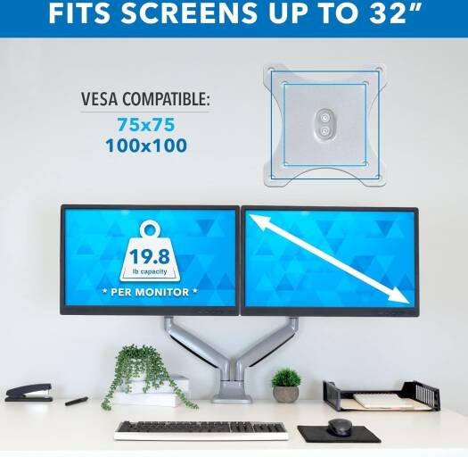 Skill Tech Dual Monitor Desk Mount Arm is designed to elevate your productivity with two fully adjustable gas spring arms, accommodating two 24 to 32-inch computer screens simultaneously