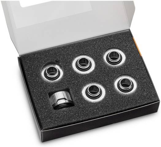 Details EK-Quantum Torque 6-Pack HDC 16 is a fitting multipack containing six EK-Quantum Torque HDC fittings. These are EK’s premium 16mm hard-tube compression fittings designed for use with solid tubing such as Acrylic and PETG. With a non-intrusive, yet striking look, and with NO added branding at all. They can be complemented by interchangeable aesthetic color rings, and are an ideal choice for anyone and a perfect match with EK-Quantum series products. To make sure they are undamaged in transport, they are packed in a box cushioned in black foam. EK-Quantum Torque series products received the prestigious iF Design Award. A robust and industrial aesthetic sets the Torque family apart by highlighting the precise manufacturing processes used to create them. In addition, enthusiasts can add a unique color ring to give a personal accent to the fitting line. The Torque family of fittings offers a secure and modular system of connections between liquid cooling components and tubing within a PC. Quantum Torque series products cover angled adapters, rotary and static extenders, splitters, G1/4″ plugs, dr