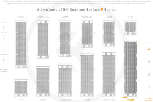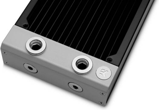 EK-Quantum Surface P560M With a thickness of 44mm, the EK-Quantum P Series Surface radiators are the absolute all-rounders for low noise and high performance across the entire fan operational range. Equipped with a total of four G1/4″ threaded connection ports, it provides additional versatility during the loop planning process, while the fifth G1/4″ port located on the end-tank is an irreplaceable feature when it comes to draining the loop and air bleeding. A total of eighteen 2mm-wide copper tubes across the entire radiator length assure optimal coolant flow, putting no stress on your cooling loop. High-grade non-louvered copper fins with 18 FPI density provide the best balance between thermal transfer and air resistance, enabling optimal performance even at low-speed fan operation. To maximize cooling performance, a Push/Pull setup can be utilized on any P Series EK-Quantum Surface radiator. New and Improved The EK-Quantum Surface P series radiator maximizes performance by utilizing a new radiator core. When comparing core to core performance, the Surface P radiator performs up to 10% better than its predecessor, the CoolStream PE, thanks to its enhanced fin structure and optimized core.