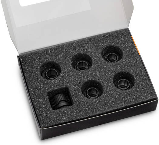 EK-Quantum Torque 6-Pack HDC 12 The EK-Quantum Torque 6-Pack HDC 12 is a fitting kit containing six EK-Quantum Torque HDC fittings. These are EK’s premium 12mm compression fittings for rigid tubing, designed for use with rigid tubing such as acrylic and PETG. With an unobtrusive yet striking look and no added branding. They can be complemented with interchangeable aesthetic color rings and are an ideal choice for anyone and match perfectly with the EK-Quantum series products. To ensure they are not damaged during transport, they are packed in a box padded with black foam. The EK-Quantum Torque series products have received the prestigious iF Design Award. A robust and industrial aesthetic sets the Torque family apart, highlighting the precise manufacturing processes used to create them. Additionally, enthusiasts can add a unique color ring to add a personal touch to the sleek line. The Torque connector family offers a secure and modular connection system between liquid cooling components and the tubing in a PC. The Quantum Torque series products include angle adapters, rotary and static extensions,