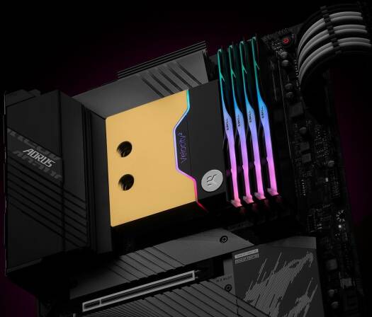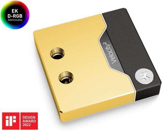 EK-Quantum Velocity² D-RGB – 1700 Nickel + Gold is a special gold-plated high-performance premium quality CPU water block for the new Intel® socket LGA 1700-based platform. It features a next-generation cooling engine that is socket-specific. This CPU water block is EK-Matrix7 compliant and is mounted via a patented EK Exact Mount system. OptiFlow Cooling Engine EK-Quantum Velocity² series CPU water blocks embed the next generation cooling engine named OptiFlow. They use a specific combination of mounting pressure and coldplate geometry tailored for the IHS and die layout of Intel LGA 1700 socket processors. Low hydraulic flow restriction enables these products to be used in setups using weaker water pumps or lower pump speeds for added silent operation, while still achieving top performance! The lathe-turned coldplate is made with precision to effectively cover the IHS and put pressure on the die area.
