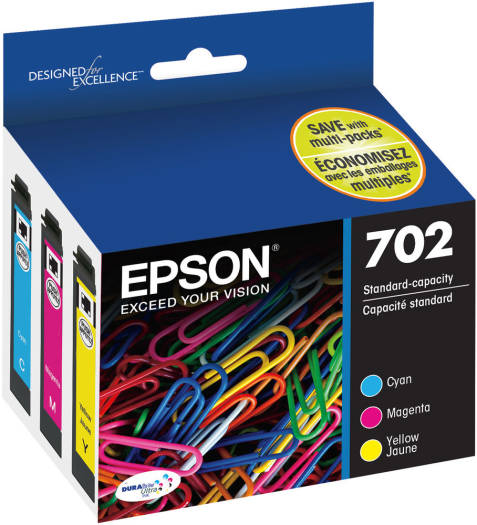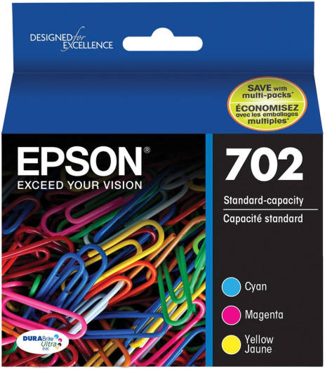 702 DURABrite Ultra Make sure you are always ready to print with this 702 DURABrite Ultra Standard-Capacity Ink Cartridge Color Multi Pack with Sensormatic from Epson, which includes cyan, magenta, and yellow cartridges. Designed for the WorkForce Pro WF-3720 printer, this color cartridge set will help produce another 300 pages. The ink is also pigment based, ensuring a print longevity of up to 84 years. Additionally, this model features a Sensormatic sensor for tracking usage. Key Features Cyan, Magenta, and Yellow Cartridges Yield: 300 Pages Pigment Based Print Longevity: Up to 84 Years