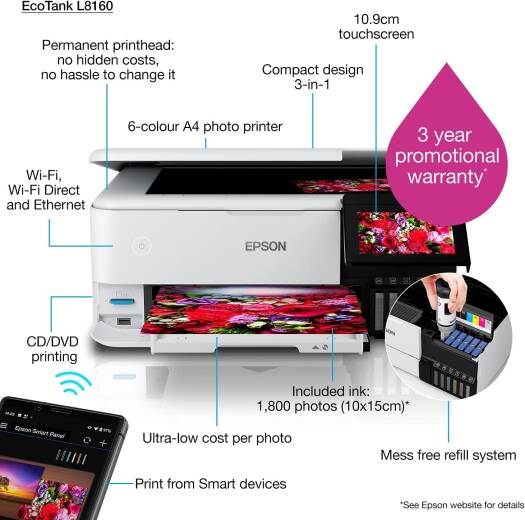 EcoTank L8160 A4 Photo Printer Unleash your creativity with stunning A4 photos and documents at incredibly lowcost-per-page. Print, copy and scan with ease using the impressive 10.9cm colour touchscreen, 5-way media handling and innovative 6-colour ink system. With no messy cartridges to replace and flexible connectivity features this is the perfect printer for the artistic modern family. Key Features 6-colour Epson Claria ET Premium Ink Print A4 borderless colour images and stunning black and white photos Ultra-low-cost printing Prints up to 2,300 high-quality photos with the replacement ink bottles Modern connectivity Wi-Fi, Wi-Fi Direct, Ethernet and Apple AirPrint enabled SKU: SKU-03A6C589 Category: Inkjet Printers Brand: Epson