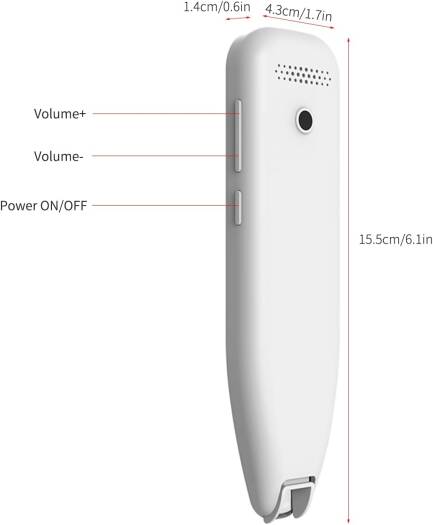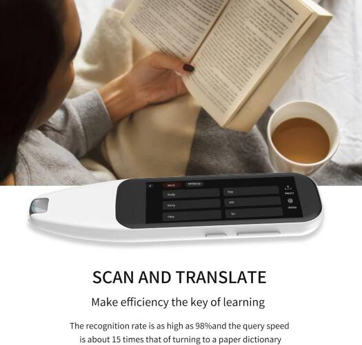 vocabularies and texts by scanning and upload to your computer by USB cable. And built-in 600 poetry for you to study. Professional Translator Pen – English and American pronunciations to choose, and 3 adjustable pronunciation speed, help children to cultivate correct pronunciation habits. With 3.46" touchscreen, more convenient operation. Multifunctional Tools – Design with new AI function, you can find the answer to the question through the AI function, such as Chinese Tang poetry, synonyms, etc. Support Intelligent Recording and MP3. Easy & Convenient to Carry – Supports WiFi/Phone Hotspot Connection, very convenient to use. BT4.0 for connecting BT speaker or BT headset. Compact size with only 88g, and 1200mAh large battery capacity of the dictionary pen, can standby 120hrs once full charged, and 4hrs using time. Specification: Product Model: C501B Color: White Shell Material: Plastic Cement Product Weight: 88g Product Size: 15.5 x 4.3 x 1.4cm/6.1 x 1.7 x 0.6in Basic Frequency: 1.3GHz Memory: 8GB/EMCP WiFi: Support 802.11b/g/n System: Android 8.1 : 3.46"LCD/IPS 340*800 Touch Screen: Full Lamination Oncell Scanning Head: Scanning 30W MIC: Silicon Speaker: 8 Ohm 1 Watt 1 Pc Battery Type: 3.7V 1200mAh Rechargeable Polymer Battery Charging Time: 2 Hours Standby Time: 120 Hours Startup Time: 30 Seconds Usage Time: 4 Hours to Application Scenario Power Input: 5V/1A USB: Type-C System Language: English & Chinese & Traditional Chinese & Jap