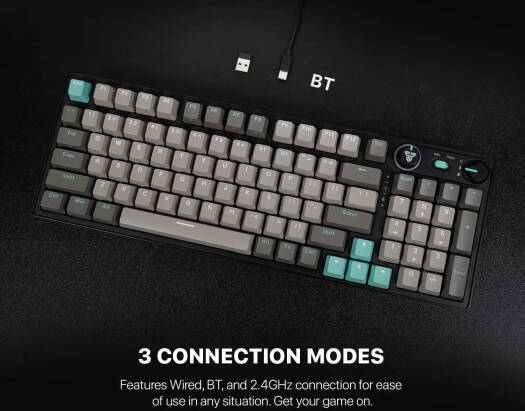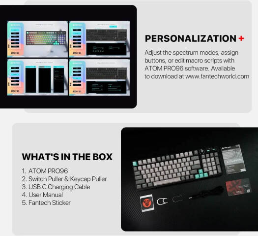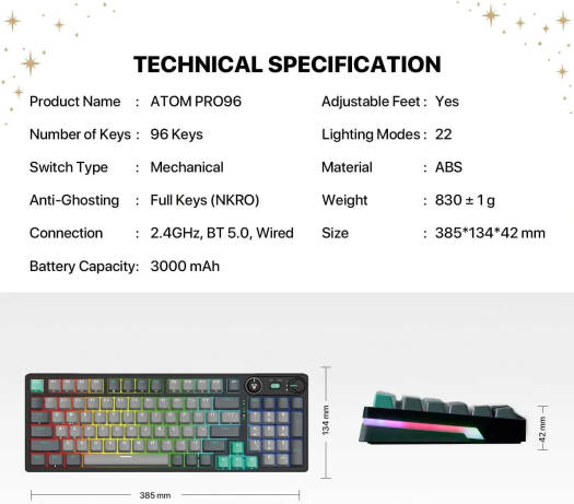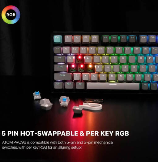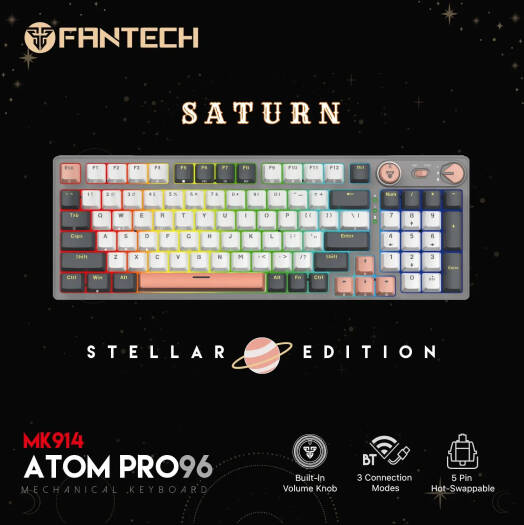 Fantech Atom Pro96 95% Mechanical Gaming Keyboard, 96 Keys, Hotswappable Keys, 22 RGB Lighting Modes, Anti-Ghosting Keys, Blue Switch, Adjustable Feet, 2.4GHz, BT5.0, Wired, 3000mAh, Saturn | MK914