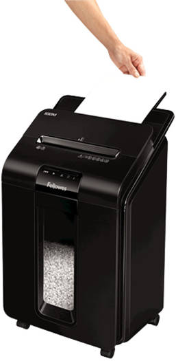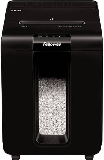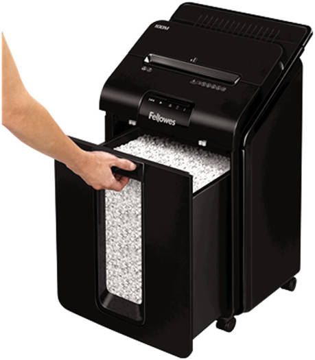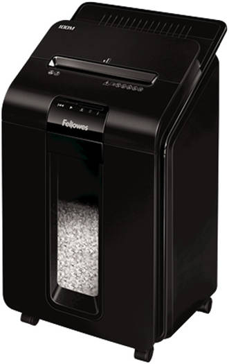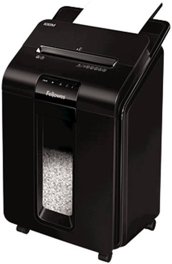 AutoMax™ 100M Mini-Cut Shredder 100-sheet auto feed and 10-sheet manual feed shredding capacity (70gsm paper) 4x10mm Mini-Cut (Security Level P-4) – Shreds each A4 sheet into over 1000 particles. Around 4x more secure than standard cross-cut Shreds non-stop for up to 15 minutes. Ideal for regular use Auto Reverse, Silentshred and Sleep Mode features ensure safe, disruption-free shredding Large, 23 litre pull-out bin and extra-small particle size give a capacity of at least 175 sheets Accepts staples, credit cards and paper clips through the manual feed slot Specifications