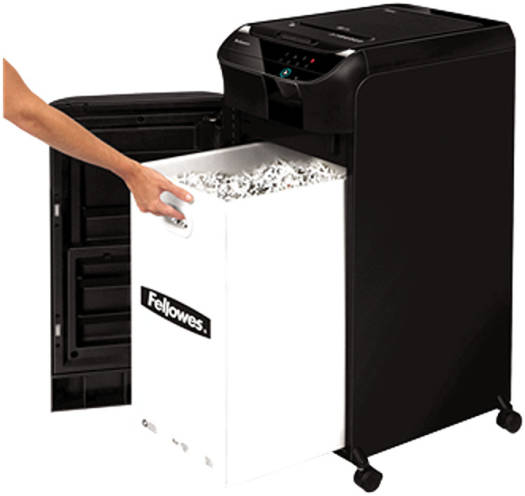 AutoMax™ 550C Cross-Cut Shredder Ideal for office environments of 5+ users that regularly accumulate large volumes of paper waste 550-sheet automatic and 14-sheet manual shredding capacities (70gsm) Shreds documents into 4x38mm cross-cut particles (DIN Level P-4) Shreds the 550-sheet capacity in approximately 13 minutes Smart Lock™ system allows the user to lock the shredder with a 4-digit PIN to prevent access to documents whilst shredding is in progress 83-litre pull-out waste bin Also shreds CDs and credit cards (manual feed) and staples & paper clips Specifications