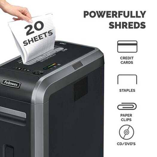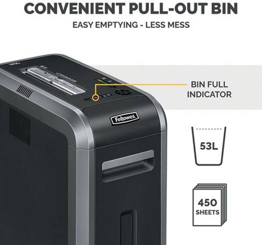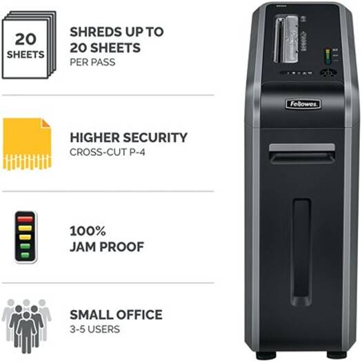 Powershed 125Ci Fellowes Powershred 125Ci cross cut shredder is designed for heavy-duty commercial use in offices and departments. Featuring a security level of P-4, the commercial shredder can accept up to 20 sheets per pass and shreds them into 5/32 x 1-1/2 inches tiny cross-cut particles. A removable bin size of 14 gallons is integrated with an LED light sensor to detect bin capacity levels and offers emptying ease. Fellowes 125Ci is a SilentShred technology to provide noiseless operations in shared offices. Various value-added features, including an automatic start and stop, safety shield in the feed opening, and automatic shut-off after extended inactivity, make the Fellowes Powershred the best in the market. Moreover, it is a 100% jam-proof shredder to avoid paper jams in case of paper overloads.