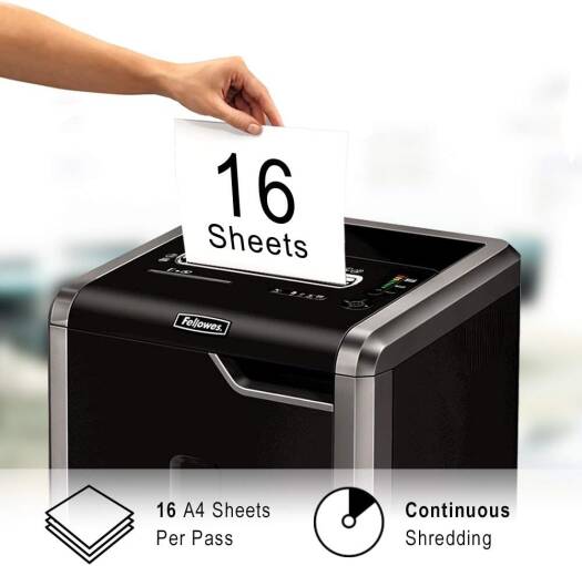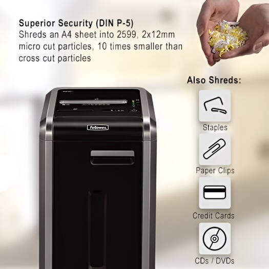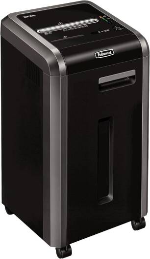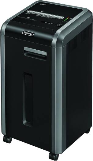 Powershred 225Mi Fellowes Powershred 225Mi is a high security paper shredder designed for departmental use by ten or more users. The level P-5 shredder turns each sheet of paper into 5/64 x 15/32 inches tiny particles. 16-gallon removable bin container stores high volumes of shredded waste material. Fellowes Powershred 225Mi is a commercial shredder design that includes 100% jam-prevention technology with auto-reverse capabilities to avoid jams or paper overloads. Powershred provides a continuous run time without the machine overheating. Specifications