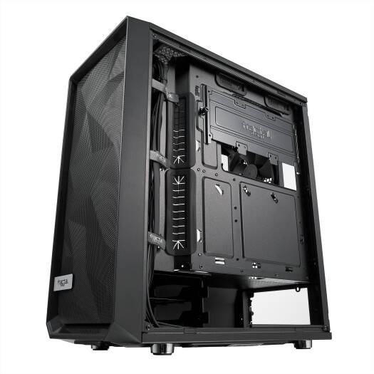 Meshify C Meshify strikes an aggressive pose in the Fractal Design lineup with unparalleled cooling performance and a defiant look. Like black diamond facets, the angular asymmetry of the Meshify C carves a space uniquely its own in high-airflow design. Specifications 3.5″ or 2.5″ Drive Capacity