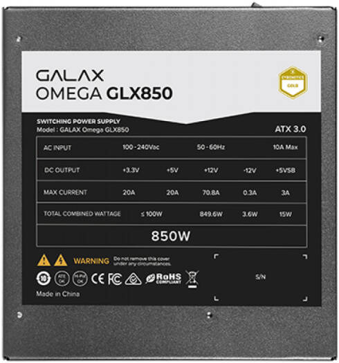GALAX OMEGA GLX850 Full-Modular Power Supply, 850W Power, 80 PLUS Gold Efficiency, Cybenetics Gold, 105° C-Rated Capacitors, 120mm Fluid Dynamic Bearing, Black | PGO85GPTNAFB0