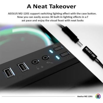 Exceptional Lightings for Victory AEOLUS M2-1201 offers 30 light effects, including white light, neon- flex RGB, multicolor, LED off, etc… With the button, you can easily switch to different lighting effects at your preference. Trio rings light up on both sides and center of fans, allowing your case glow from all angles. One Click, Sync All AEOLUS M2-1201 supports RGB motherboard manufacture’s sync software that has addressable lighting which can present and customize your personal feature ,5V 3-pin RGB header (ASUS & ASROCK), JRAINBOW (MSI) or Digital Pin Header (GIGABYTE), which makes it easier to unite your case from chaos to calm. A Neat Takeover Having trouble on finding the right strip? No worries, AEOLUS M2-1201 suppor