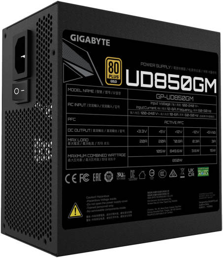 GIGABYTE UD850GM 850W Fully Modular Power Supply, 80 PLUS Gold Certified, 120mm Smart Hydraulic Bearing (Hyb) Fan, Powerful single +12V Rail, Main Japanese Capacitors, Black | GP-UD850GM