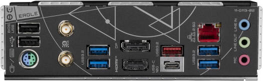 | Back I/O | PS/2, 1x USB-C (Gen2), 1x USB 3.2 Gen2 Type-A, 4x USB 3.2 Gen1, 2x USB 2.0, HDMI, DP, RJ-45, audio jacks, Wi-Fi antenna |