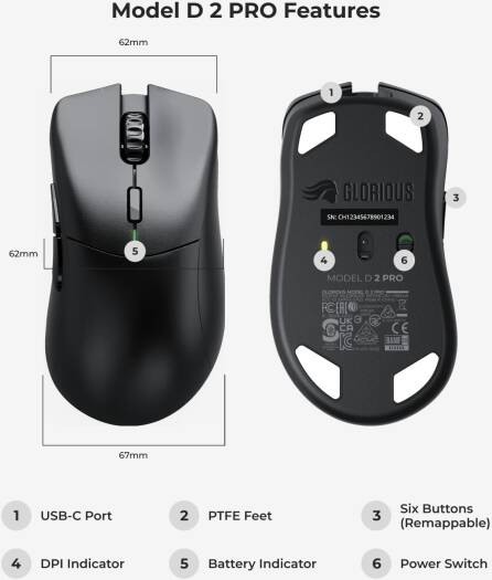 Glorious Gaming Model D 2 PRO Wireless Gaming Mouse, 2.4GHz wireless 1ms delay, 100M clicks, 60g Ultralight, Long Battery Life, 26K DPI, RGB, Ergonomic, 6 Buttons, PTFE Feet, Black | GLO-MS-PDWV2-1K-B