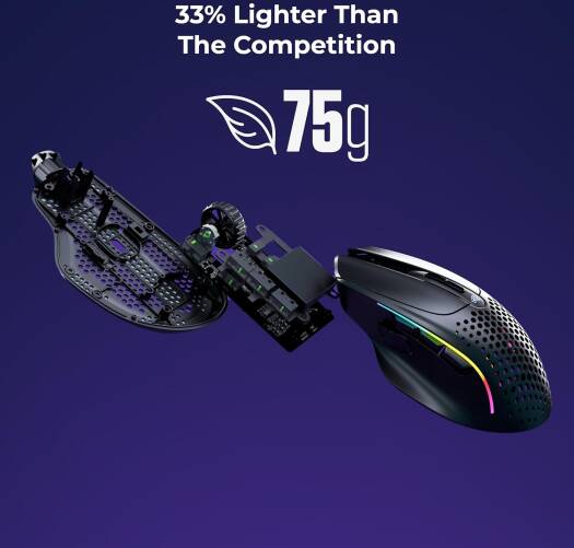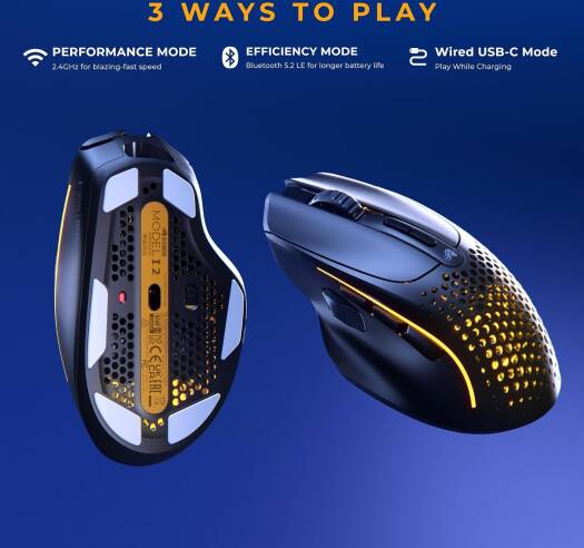 MODEL I 2 WIRELESS ULTRALIGHT ERGONOMIC GAMING MOUSE The most comfortable ultralight wireless mouse, packed with next-gen tech in a modular ergonomic design. 9 programmable buttons with customizable side controls make it ideal for Battle Royale, MOBA, MMO and FPS games. Key Features Ultralight 75-gram weight Contoured ergonomic shape 9 programmable buttons Swappable magnetic side buttons Specifications Weight 75 grams*