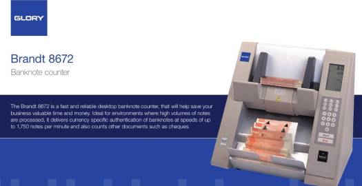 RELIABILITY With an international reputation for robustness and reliability, processing all format and condition of notes, the Glory Brandt 8672 is used worldwide and is the machine of choice for many national banks and cash processing centres. It handles Pounds, Euros, Dollars, Yen, Swiss Francs and the currencies of all Asian, African and Middle East countries. USABILITY The Brandt 8672 is simple to use with a LCD display and touch pad to control the device. Due to its size, the Brandt 8672 can be effortlessly transported and uses very little counter space SUITABILITY The Brandt 8672 is suitable for use in banks, cash centres, large retail operations and commercial deposit centres. It can easily handle a wide range of banknotes and vouchers of all qualities. EASY TO USE DISPLAY & CONTROLS The large LCD display and touch pad places the control of the machine at the operator's fingertips. The wide document loading and removal trays allow notes and other securities to be input and removed quickly and easily. CONVENIENT SIZE The Brandt 8672 utilises minimal counter space and fits into any currency processing environment. Because of its convenient size, the Brandt 8672 can be easily transported. MULTI-FUNCTION COUNTERFEIT DETECTION Counterfeit or rogue note detection by height (SD) is a standard feature. An optional SD