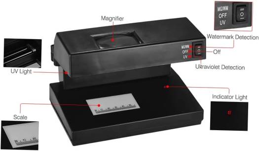 GONEER Portable Desktop Counterfeit Bill Detector Cash Currency Banknotes Notes Checker Machine Support Ultraviolet UV and Watermark Detection with Magnifier Forged Money Tester for USD EURO POUND, EU