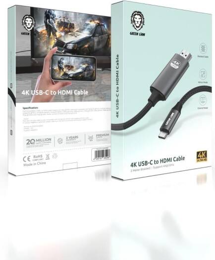 Green Lion 4K 30Hz USB-C to HDMI Cable,Braided Cable,Mirror Mode,Extend Mode,2 Meter Cable,Aluminum Shell,Durable Material,Speed & Power Combined – Bl