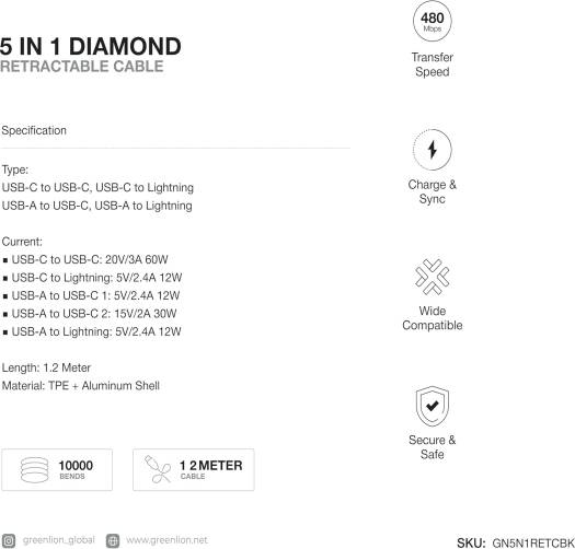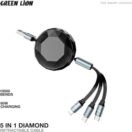Green Lion 5 in 1 Diamond Retractable 60W Cable, USB-A/USB-C/Lightning head 1.2M Length Wire, 10000 Bends, 480Mbps Data Transfer Speed, Wide Compatibility, Charge & Sync, Scure & Safe – Black