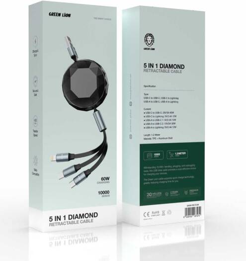 The Green Lion 5-in-1 Diamond Retractable 60W Cable is designed for fast, efficient charging and data transfer with a 1.2M length wire. Featuring USB-A, USB-C, and Lightning head, this versatile cable offers wide compatibility with a variety of devices. With a 60W power output, it supports rapid charging and 480Mbps data transfer speed for seamless syncing. Built to last, the cable is rated for 10,000 bends, ensuring durability and longevity. Its retractable design keeps your workspace neat and organized while providing secure and safe performance.