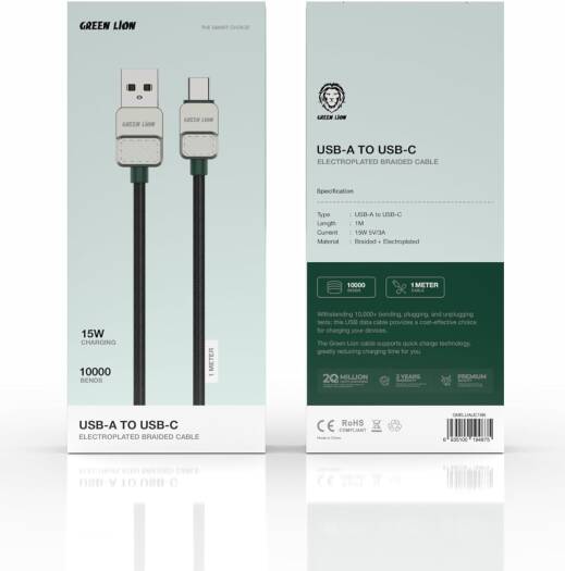 Green Lion Braided Electroplated 1m Cable, Wide Compatible, Charge & Sync, Secure & Safe, High Transfer Speed, Reliable Charging, Enhanced Durability, 10000 Bends – Black (USB A to Type-C 15W)