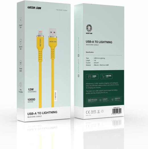 Green Lion USB-A To Lightning Head Silicone 1M Cable 12W, Charge & Sync, Safe & Reliable Charging, 480Mbps Transfer Speed, Wide Compatibility, 10000 Bends, Durable Aluminum Shell – Yellow
