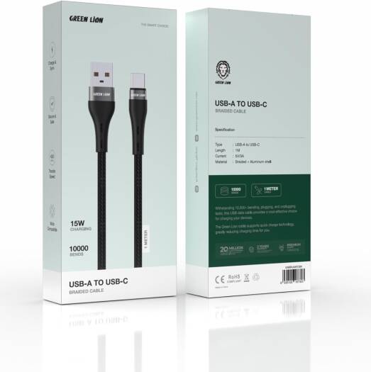 Green Lion USB-A To USB-C Braided Cable 1M 15W,Charge & Sync,Safe & Reliable Charging,480Mbps Transfer Speed,Wide Compatible,10000 Bends,Aluminum Shel