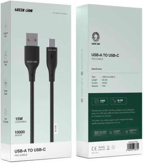Green Lion USB-A TO USB-C PVC Cable 30 CM,480Mbps Transfer Speed,Wide Compatible,Secure & Safe,Charge & Sync,Withstanding +10000 Bedings,PVC Cable,15W