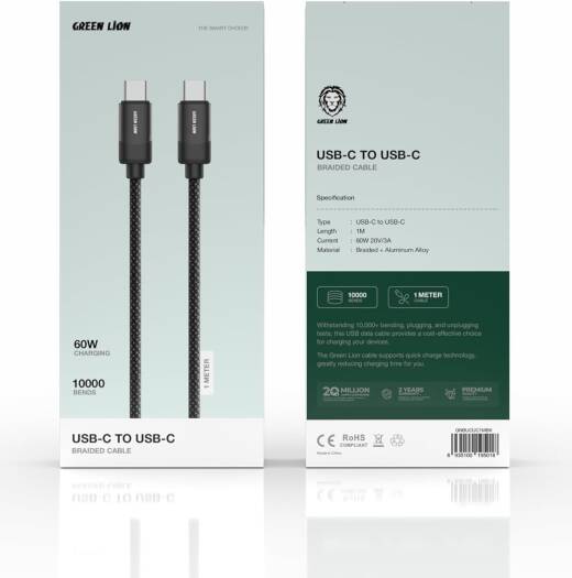 Green Lion USB-C to USB-C Braided Cable, 1M Wired Length, 10000 Bends, 480 Mbps Transfer Speed, Aluminum Alloy Material, Wide Compatibility, Secure & Safe – Black