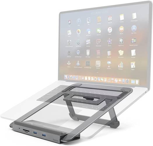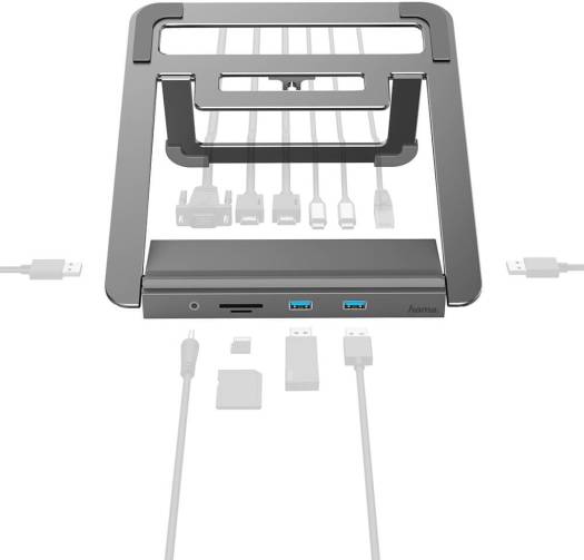 Hama 200106 USB-C Docking Station & Notebook Stand, 12 Ports, USB-A, USB-C, VGA, HDMI, LAN, SD & MicroSD Card Reader, 3.5mm Audio Ports, 5Gbps Data Transfer Rate, Grey | 4047443449160