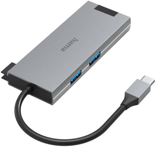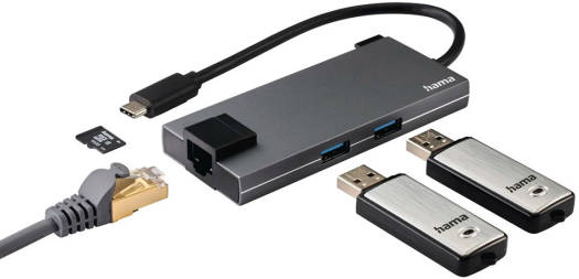 Hama USB-C Hub, Multiport Super speed data transfer rates of up to 5 Gbps USB-C socket supports USB Power Delivery (USB PD) and rapid data transfer For perfect, high-resolution ultra-HD cinema quality with 4096×2160 (4K) pixels Gigabit Ethernet data transfer at up to 1 Gbps Convenient cable management thanks to handy holder for the connecting cable High-quality and sturdy aluminium housing with a sophisticated finish Large socket distance allows problem-free connection even of wide plugs Flexible materials guarantee optimum kink protection and prevent cable breakage High-quality materials and workmanship guarantee excell