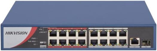 Hikvision 16 Port Fast Ethernet Unmanaged POE Switch, 7.2 Gbps Switching Capacity, 5.356 Mpps Forwarding Rate, 16x 10/100 Mbps PoE, 1x Gigabit RJ45, 1x Gigabit Fiber Optical Ports | DS-3E0318P-E/M(B)
