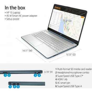 HP 15-EF2126WM 15.6″ Full HD Notebook, 1920×1080 Resolution, AMD Ryzen 5-5500U 4.0 GHz, 8GB RAM, 256GB SSD, Radeon Graphics, SD Card Reader, Windows 11, Spruce Blue | 4J771UA#ABA