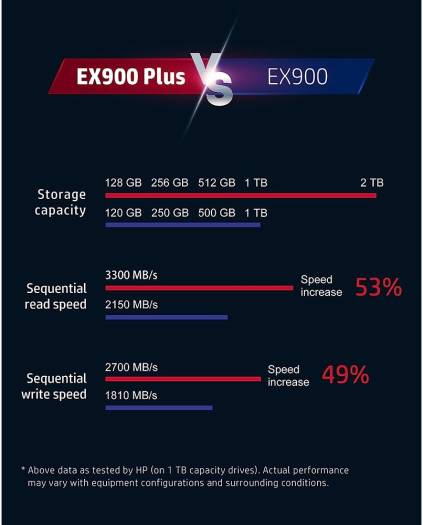About this item Fast, Stable and Accurate: HP EX900 PLUS is equipped with 4-channel PCIe 3.0 master control and supports NVMe 1.3 protocol standard for powerful performance. Read speed up to 3300 MB/s and write speed up to 2700 MB/s. This accelerates game loading, shortens wait times, and effectively improves system responsiveness. 3D NAND Flash: Uses premium 3D NAND flash to break storage space limitations and double the storage density of its predecessor, offering 128 GB, 256 GB, 512 GB, 1 TB and 2 TB. It can easily store your large files and video games. Passes Multiple Rigorous Tests: Uses carefully selected high-quality components and passes a number of rigorous tests such as electrical testing, application testing, and compatibility testing before leaving the factory, while enjoying thoughtful quality after-sales service, including a five years limited warranty and free technical support services.