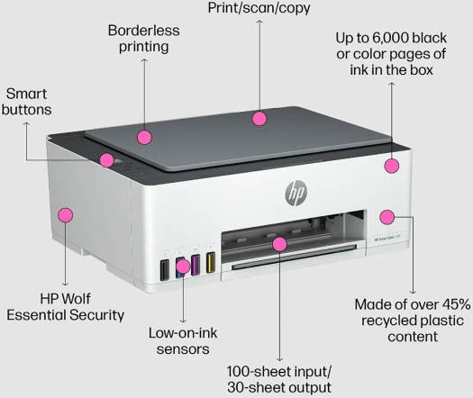 HP Smart Tank 520 All-in-One Printer Enjoy everyday reliability with the HP Smart Tank 520 All-in-One Printer that delivers HP quality you expect and savings that are anything but expected. A4 Color Inkjet All-in-One Printer, Perfect for Home Low cost-per-page at just 0.004 cent (color) & 0.004 cent (black) Print, Scan and Copy Print speed up to 12 ppm (black) and 5 ppm (color) USB
