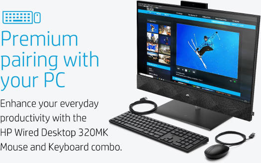 320MK Desktop Mouse & Keyboard Work efficiently and enhance your everyday productivity with the reliable Wired Desktop 320MK Mouse and Keyboard from HP , both of which are Windows compatible and connect to your host system via integrated 70.86″ USB-A cables. The full-size, spill-resistant keyboard has a three-zone layout with a number pad, arrow keys, 6° tilt-adjustable slope for your wrist position, and low profile key travel. Navigate documents in either hand using a 3-button optical mouse with 1000 dpi. This keyboard and mouse can also be cleaned up to 1000 times with disinfecting wipes.