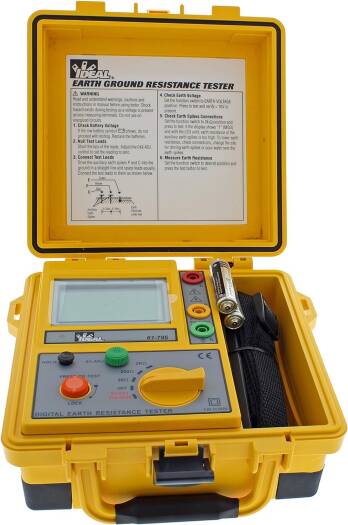 The IDEAL Earth Ground Resistance Tester measures ground rod resistance using 3-poles. Measures earth voltage. Includes green, yellow and red color-coded test leads and electrodes. Also comes with a hard durable carrying case so that you can safely and easily transport it from worksite to worksite. Features a low battery indcator so that you can ensure that your tester is always charged and ready to use. IDEAL Electrical has been committed to the craft and its craftsmen for more than 100 years. Whether you™re the electrical contractor or datacomm technician, production engineer or plant manager, we know the job the way you know the job.