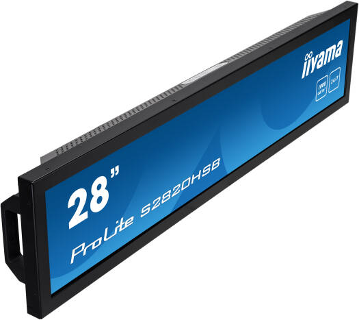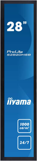 ProLite S2820HSB-B1 28″ stretched digital signage display with 24/7 operating time, 1000cd/m² and landscape and portrait orientation Give your sales promotions and in-store displays maximum impact and visibility with the ProLite S2820HSB-B1. The S2820HSB is a 28″ stretched (1920×360) digital signage display that is ideally suited for retail, transportation, business and health care environments where a regular 16:9 display will not fit. With a 24/7 operating time, landscape and portrait orientation and brightness of 1000cd/m2, this display can be installed anyhow and anywhere you want, ensuring an optimal fit and maximum exposure. The S2820HSB is fanless, only weighs 5,5 kg and comes with two handles for easy handling and installation. Specifications