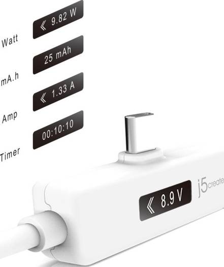 Since the advent of the computer, the specification of the power supply has been a headache to determine. With this cable, you will know your charging specifications easily and accurately. Avoid falling into power shortages and other mishaps. Features • Supports USB ™ 2.0 (480 Mbps) • Displays information regarding voltage, amp, watt, direction, timer and milliamp-hours (mAh) • Supports a max current of 100 Watts/5 Amps • Cable length 4 ft/120 cm with OLED • High accuracy up to two decimal places • Small reversible connector • Built in Electronically Marked IC for Power Delivery 2.0 specifications