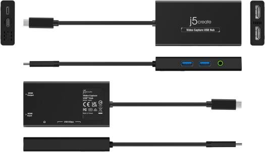 J5create Video Capture USB Hub, 2x USB-C, 2x HDMI, 3.5mm Audio Jack 2x USB-A Ports, Up to 60W via USB-C Power Delivery 4K @ 30 Hz Resolution, Black | JVA01
